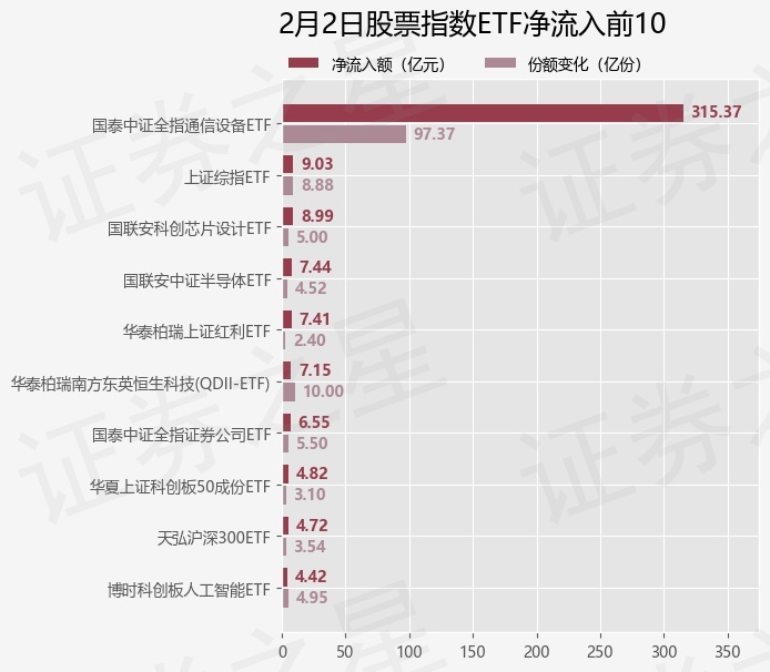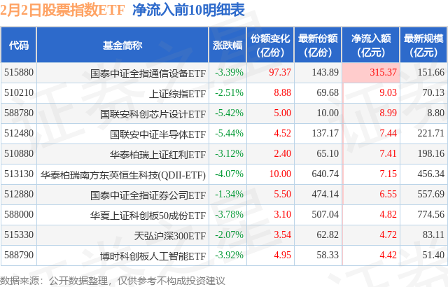 当日有271只股票指数ETF基金出现资金净流入,其中净流入排首位的是国泰中证全指通信设备ETF(515880),份额增加了97.37亿份,净流入额为315.37亿元。