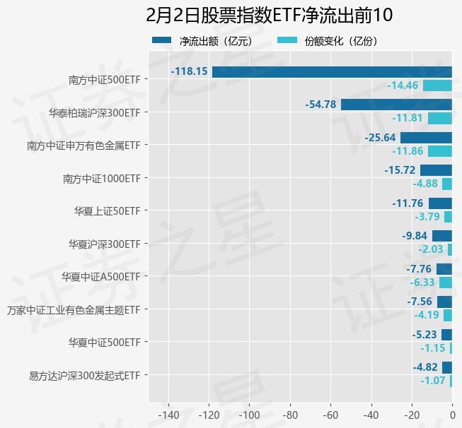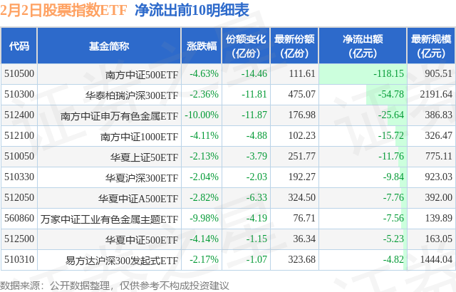 当日有191只股票指数ETF基金出现资金净流出,其中净流出排首位的是南方中证500ETF(510500),份额减少了14.46亿份,净流出额为118.15亿元。