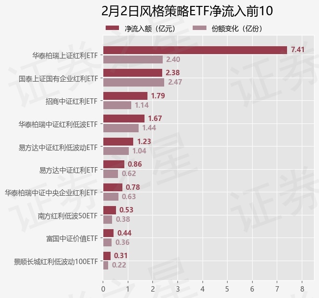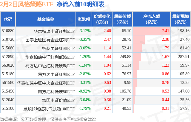 当日有19只风格策略ETF基金出现资金净流入,其中净流入排首位的是华泰柏瑞上证红利ETF(510880),份额增加了2.4亿份,净流入额为7.41亿元。