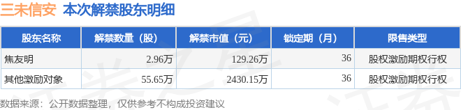 证券之星消息,根据市场公开信息整理,三未信安(688489)于2月3日将有58.61万股限售股份解禁,为公司股权激励期权行权,占公司总股本0.51%。(本次数据根据历史公告整理得出,实际情况以上市公司最新公告为准)最近一年内,该股累计解禁6277.03万股,占总股本的54.48%。本次解禁后,公司还有87.91万股限售股份,占总股本0.76%。具体如下图所示: