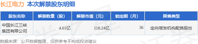 证券之星消息,根据市场公开信息整理,长江电力(600900)于2月3日将有4.61亿股限售股份解禁,为公司定向增发机构配售股份,占公司总股本1.88%。(本次数据根据历史公告整理得出,实际情况以上市公司最新公告为准)本次解禁后,公司已无限售股份。具体如下图所示: