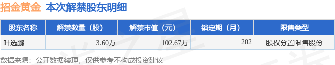 证券之星消息,根据市场公开信息整理,招金黄金(000506)于2月3日将有3.6万股限售股份解禁,为公司股权分置限售股份,占公司总股本0.0%。(本次数据根据历史公告整理得出,实际情况以上市公司最新公告为准)本次解禁后,公司还有31.08万股限售股份,占总股本0.03%。具体如下图所示: