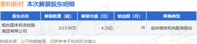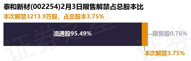 证券之星消息,根据市场公开信息整理,泰和新材(002254)于2月3日将有3213.9万股限售股份解禁,为公司定向增发机构配售股份,占公司总股本3.75%。(本次数据根据历史公告整理得出,实际情况以上市公司最新公告为准)最近一年内,该股累计解禁37.76万股,占总股本的0.04%。本次解禁后,公司还有648.93万股限售股份,占总股本0.76%。具体如下图所示: