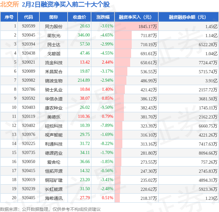 北交所融资净买入前三分别为:同力股份(920599)融资净买入1845.17万元、蘅东光(920045)融资净买入711.87万元、民士达(920394)融资净买入710.19万元,前20具体见下表: