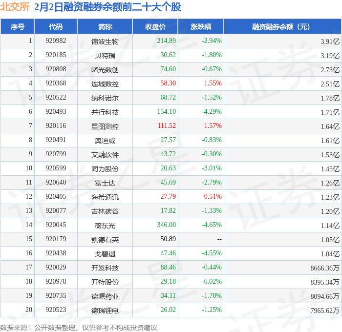 北交所融资融券余额前三分别为:锦波生物(920982)融资融券余额3.91亿元、贝特瑞(920185)融资融券余额3.19亿元、曙光数创(920808)融资融券余额2.73亿元,前20具体见下表: