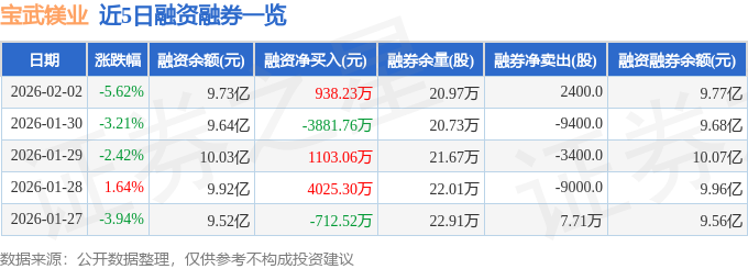 宝武镁业融资融券信息显示,融资方面,当日融资买入7618.09万元,融资偿还6679.86万元,融资净买入938.23万元。融券方面,融券卖出5700.0股,融券偿还3300.0股,融券余量20.97万股,融券余额370.16万元。融资融券余额9.77亿元。