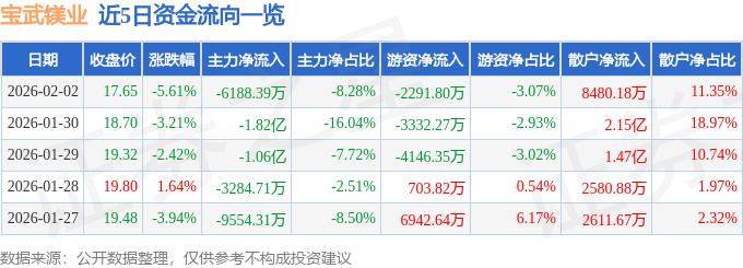 证券之星消息,截至2026年2月2日收盘,宝武镁业(002182)报收于17.65元,下跌5.61%,换手率4.81%,成交量41.61万手,成交额7.47亿元。