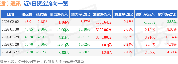 2月2日的资金流向数据方面,主力资金净流入1.16亿元,占总成交额3.37%,游资资金净流入1660.64万元,占总成交额0.48%,散户资金净流出1.33亿元,占总成交额3.85%。