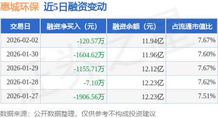 证券之星消息,2月2日,惠城环保(300779)融资买入3382.66万元,融资偿还3503.23万元,融资净卖出120.57万元,融资余额11.94亿元。