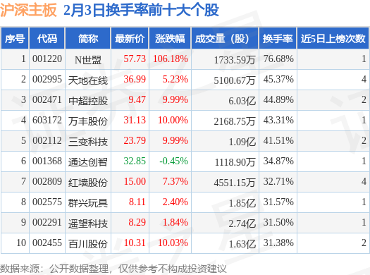 当日沪深主板换手率前10大个股中9只个股收涨,平均涨幅18.11%,其中N世盟(001220)以换手率76.68%排第一,5只个股近5个交易日中多次上榜。