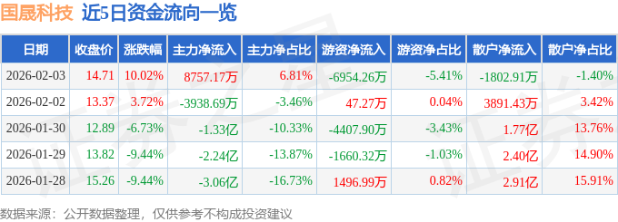 证券之星消息,国晟科技2月3日涨停收盘,收盘价14.71元。该股于13点16分涨停,1次打开涨停,截止收盘封单资金为6645.9万元,占其流通市值0.7%。