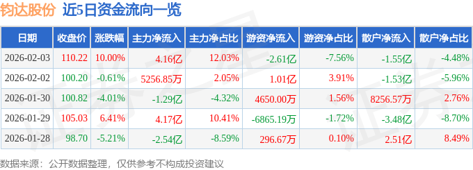 2月3日的资金流向数据方面,主力资金净流入4.16亿元,占总成交额12.03%,游资资金净流出2.61亿元,占总成交额7.56%,散户资金净流出1.55亿元,占总成交额4.48%。