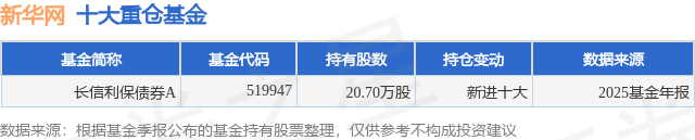 根据2025基金年报公募基金重仓股数据,重仓该股的公募基金共1家,其中持有数量最多的公募基金为长信基金的长信利保债券A。长信利保债券A目前规模为0.63亿元,最新净值1.2373(2月2日),较上一交易日下跌0.99%,近一年上涨4.89%。该公募基金现任基金经理为冯彬。冯彬在任的基金产品包括:长信金葵纯债一年定开债券A,管理时间为2019年10月11日至今,期间收益率为32.06%;长信稳裕三个月定开债,管理时间为2019年10月11日至今,期间收益率为40.63%;长信富安纯债180天持有债券A,管理时间为2019年10月11日至今,期间收益率为33.82%;
