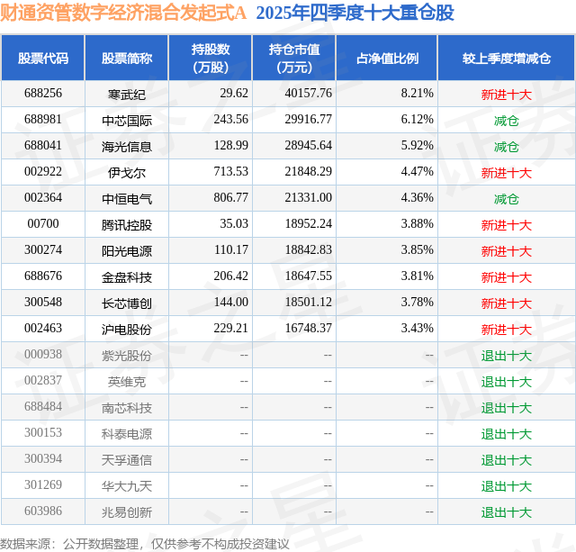 财通资管数字经济混合发起式A的前十大重仓股如下: