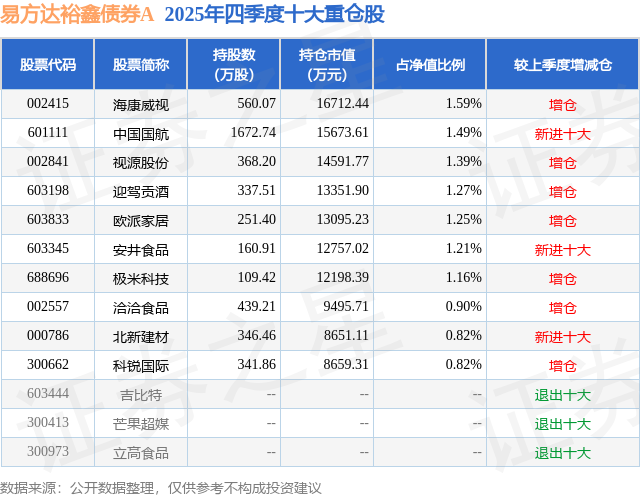 根据2025基金年报公募基金重仓股数据,重仓该股的公募基金共13家,其中持有数量最多的公募基金为易方达基金的易方达裕鑫债券A。易方达裕鑫债券A目前规模为60.5亿元,最新净值1.8086(2月2日),较上一交易日下跌0.95%,近一年上涨20.08%。该公募基金现任基金经理为胡文伯。胡文伯在任的基金产品包括:易方达鑫转招利混合A,管理时间为2023年3月16日至今,期间收益率为30.28%;易方达磐固六个月持有期混合A,管理时间为2023年6月21日至今,期间收益率为7.64%。