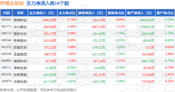 从资金流向上来看,当日种植业板块主力资金净流出2.36亿元,游资资金净流出19.02万元,散户资金净流入2.36亿元。种植业板块个股资金流向见下表: