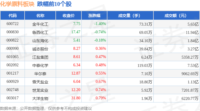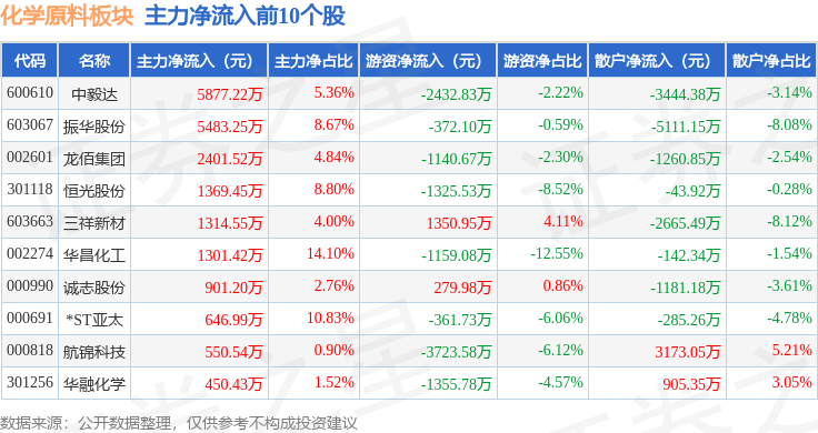 从资金流向上来看,当日化学原料板块主力资金净流出3.93亿元,游资资金净流出6747.49万元,散户资金净流入4.61亿元。化学原料板块个股资金流向见下表: