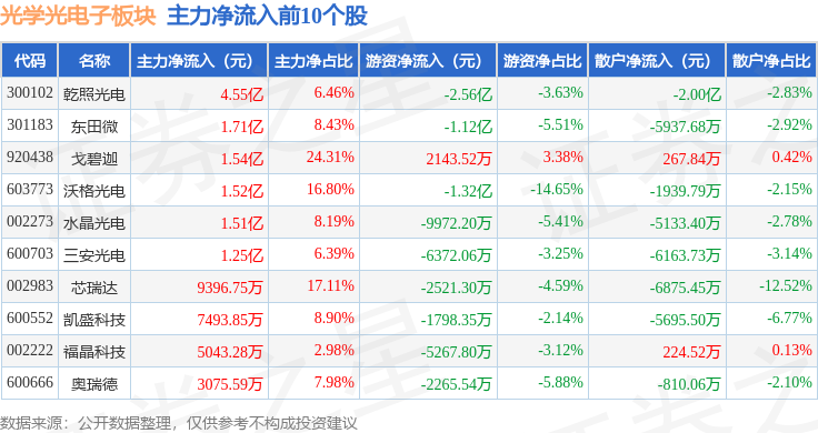从资金流向上来看,当日光学光电子板块主力资金净流入7.27亿元,游资资金净流出9.65亿元,散户资金净流入2.38亿元。光学光电子板块个股资金流向见下表: