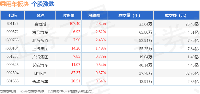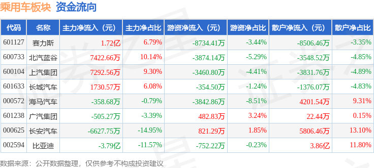 从资金流向上来看,当日乘用车板块主力资金净流出1.17亿元,游资资金净流出1.97亿元,散户资金净流入3.14亿元。乘用车板块个股资金流向见下表: