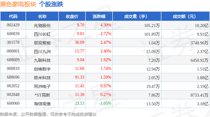 证券之星消息,2月3日黑色家电板块较上一交易日上涨2.14%,兆驰股份领涨。当日上证指数报收于4067.74,上涨1.29%。深证成指报收于14127.1,上涨2.19%。黑色家电板块个股涨跌见下表: