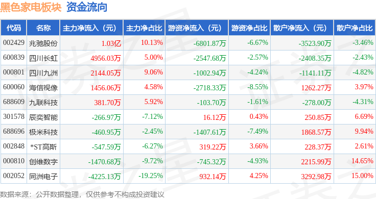 从资金流向上来看,当日黑色家电板块主力资金净流入1.23亿元,游资资金净流出1.41亿元,散户资金净流入1767.67万元。黑色家电板块个股资金流向见下表: