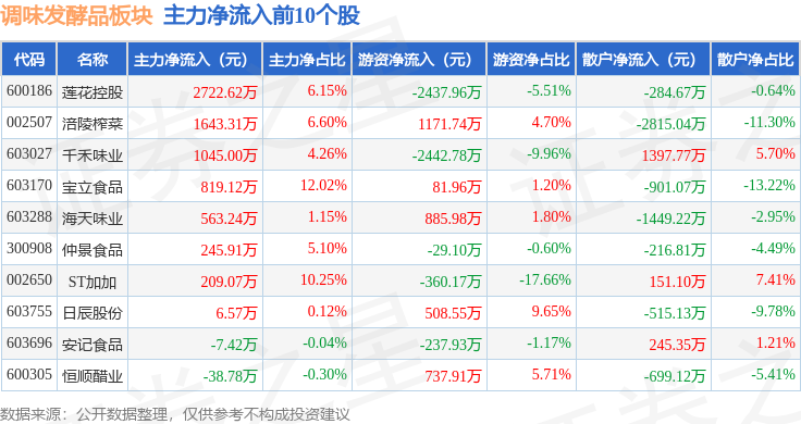 从资金流向上来看,当日调味发酵品板块主力资金净流入926.67万元,游资资金净流出8166.72万元,散户资金净流入7240.05万元。调味发酵品板块个股资金流向见下表: