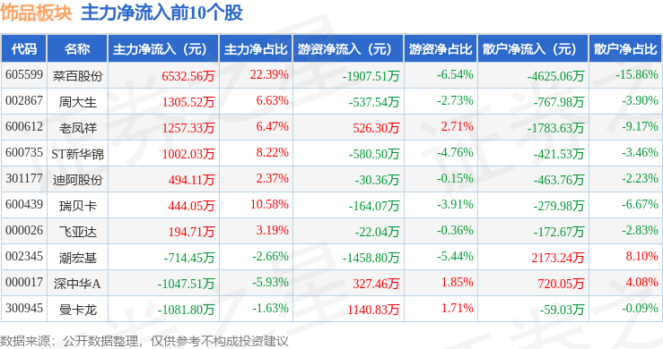 从资金流向上来看,当日饰品板块主力资金净流出5.55亿元,游资资金净流入1.62亿元,散户资金净流入3.92亿元。饰品板块个股资金流向见下表:
