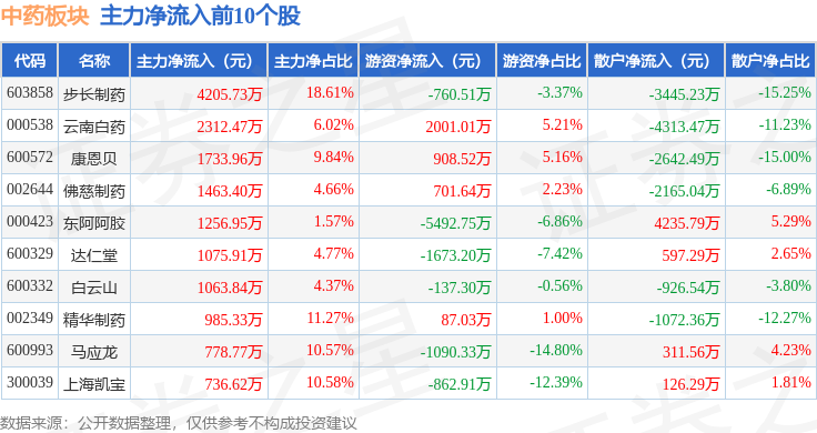 从资金流向上来看,当日中药板块主力资金净流出1.93亿元,游资资金净流入273.9万元,散户资金净流入1.9亿元。中药板块个股资金流向见下表: