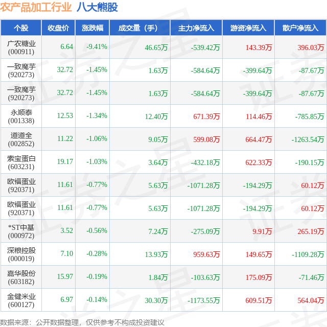 个股表现方面,农产品加工行业当日领跌股为广农糖业(000911),该股当日报收6.64,下跌9.41%,成交量46.65万,主力资金净流出539.42万元。一致魔芋(920273)以下跌1.45%紧随其后,该股当日成交量1.63万,主力资金净流出584.64万元。除此之外,一致魔芋(920273)、永顺泰(001338)、道道全(002852)均进入当日熊股之列。具体个股列表见下表:
