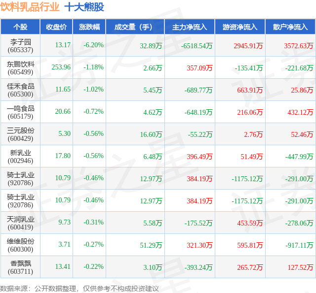个股表现方面,饮料乳品行业当日领跌股为李子园(605337),该股当日报收13.17,下跌6.2%,成交量32.89万,主力资金净流出6518.54万元。东鹏饮料(605499)以下跌1.18%紧随其后,该股当日成交量2.66万,主力资金净流入357.09万元。除此之外,佳禾食品(605300)、一鸣食品(605179)、三元股份(600429)均进入当日熊股之列。具体个股列表见下表: