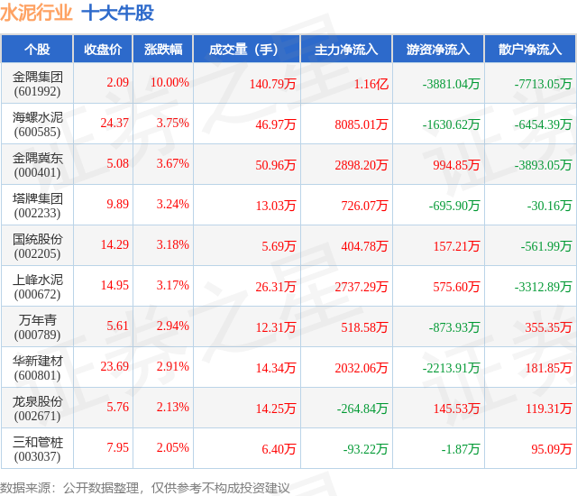 个股表现方面,水泥行业当日领涨股为金隅集团(601992),该股当日报收2.09,上涨10.0%,成交量140.79万,主力资金净流入1.16亿元。海螺水泥(600585)以上涨3.75%紧随其后,该股当日成交量46.97万,主力资金净流入8085.01万元。除此之外,金隅冀东(000401)、塔牌集团(002233)、国统股份(002205)均进入当日牛股之列。具体个股列表见下表: