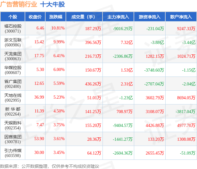 个股表现方面,广告营销行业当日领涨股为福石控股(300071),该股当日报收6.46,上涨10.81%,成交量187.29万,主力资金净流出9016.29万元。浙文互联(600986)以上涨9.99%紧随其后,该股当日成交量396.56万,主力资金净流入7.32亿元。除此之外,天龙集团(300063)、华媒控股(000607)、省广集团(002400)均进入当日牛股之列。具体个股列表见下表: