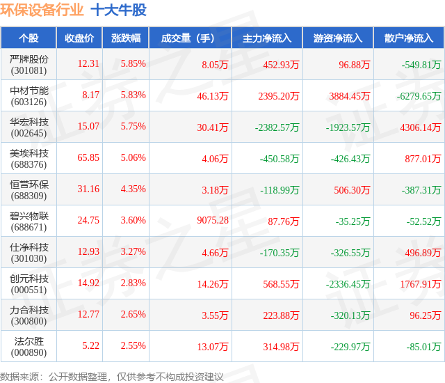 个股表现方面,环保设备行业当日领涨股为严牌股份(301081),该股当日报收12.31,上涨5.85%,成交量8.05万,主力资金净流入452.93万元。中材节能(603126)以上涨5.83%紧随其后,该股当日成交量46.13万,主力资金净流入2395.2万元。除此之外,华宏科技(002645)、美埃科技(688376)、恒誉环保(688309)均进入当日牛股之列。具体个股列表见下表: