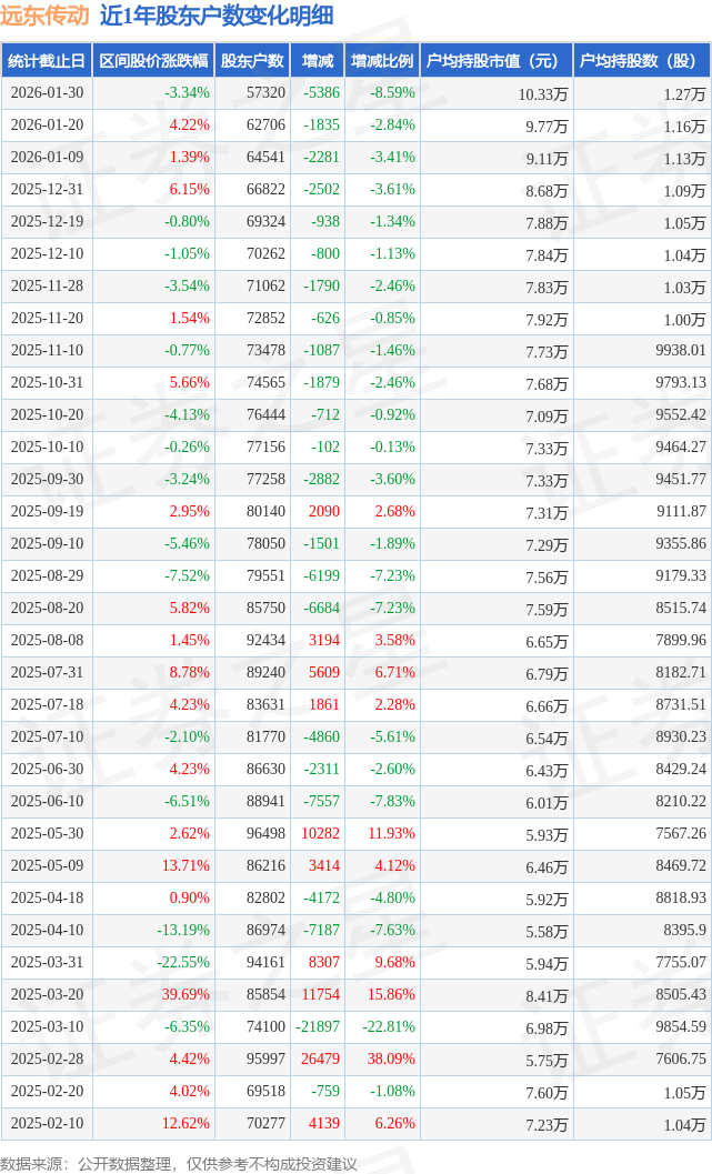 从股价来看,2026年1月20日至2026年1月30日,远东传动区间跌幅为3.34%,在此期间股东户数减少5386.0户,减幅为8.59%。