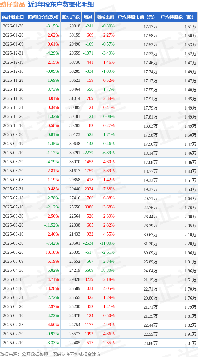 从股价来看,2026年1月20日至2026年1月30日,劲仔食品区间跌幅为3.15%,在此期间股东户数减少241.0户,减幅为0.8%。