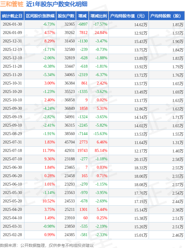 从股价来看,2026年1月9日至2026年1月30日,三和管桩区间跌幅为6.73%,在此期间股东户数减少6897.0户,减幅为17.57%。
