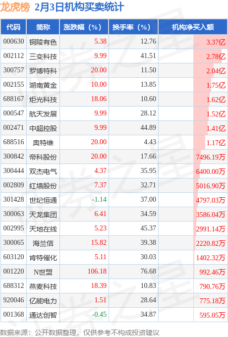 当日公布的交易所龙虎榜中有机构专用席位现身的个股共35家,其中铜陵有色以净买入3.37亿元排名第一。详情见下表: