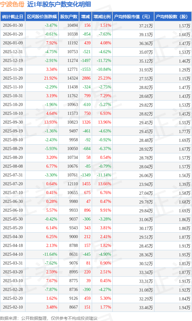 从股价来看,2026年1月20日至2026年1月30日,宁波色母区间跌幅为3.47%,在此期间股东户数增加156.0户,增幅为1.51%。