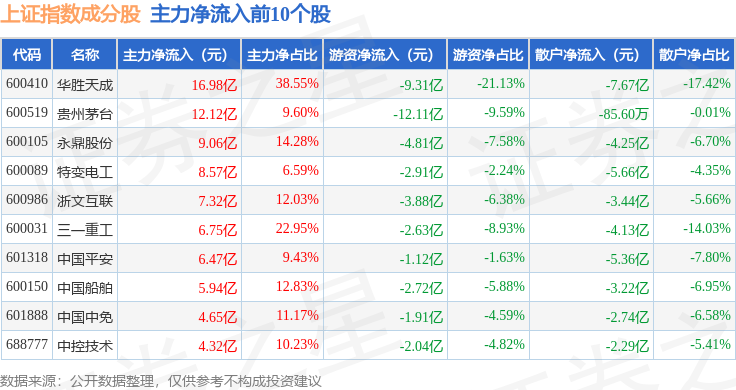 资金流向方面,上证指数(000001)成份股当日主力资金净流入合计70.96亿元,游资资金净流出合计140.31亿元,散户资金净流入合计69.35亿元。成份股资金流向详情见下表: