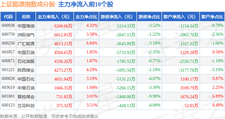 资金流向方面,上证能源(000032)指数成份股当日主力资金净流出合计1.28亿元,游资资金净流出合计1.95亿元,散户资金净流入合计3.23亿元。成份股资金流向详情见下表: