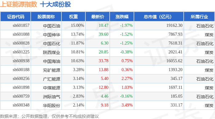 上证能源(000032)指数十大成份股详情如下: