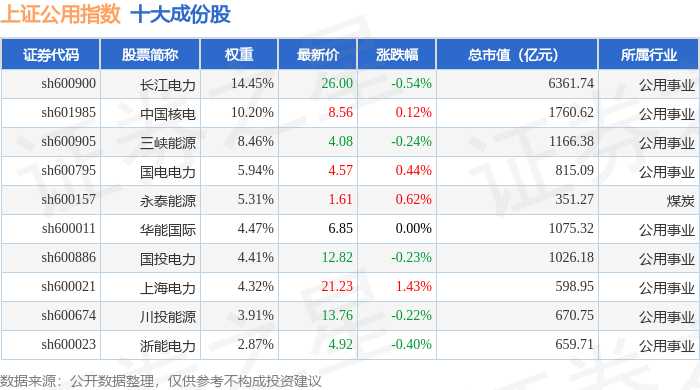 证券之星消息,2月3日,上证公用(000041)指数报收于2516.48点,涨0.29%,成交137.86亿元,换手率0.91%。当日该指数成份股中,上涨的有19家,桂冠电力以4.22%的涨幅领涨,下跌的有10家,华能水电以0.88%的跌幅领跌。