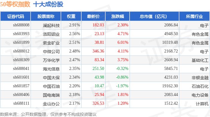 证券之星消息,2月3日,50等权(000050)指数报收于2418.62点,涨0.91%,成交1927.8亿元,换手率0.39%。当日该指数成份股中,上涨的有29家,三一重工以7.95%的涨幅领涨,下跌的有21家,寒武纪以9.18%的跌幅领跌。
