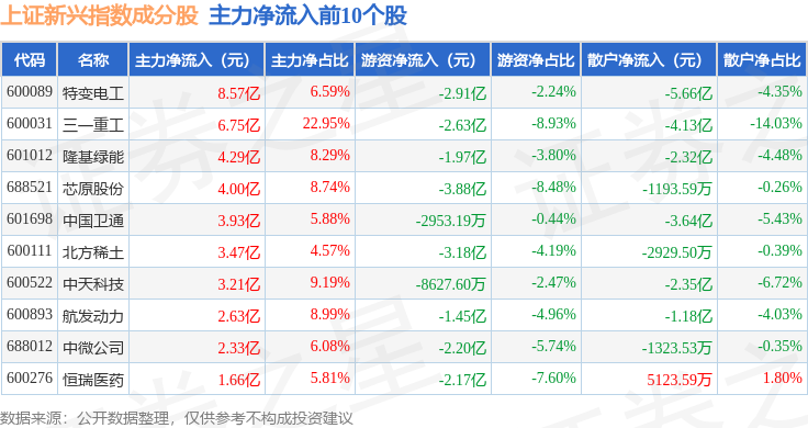 资金流向方面,上证新兴(000067)指数成份股当日主力资金净流入合计17.86亿元,游资资金净流出合计14.97亿元,散户资金净流出合计2.88亿元。成份股资金流向详情见下表: