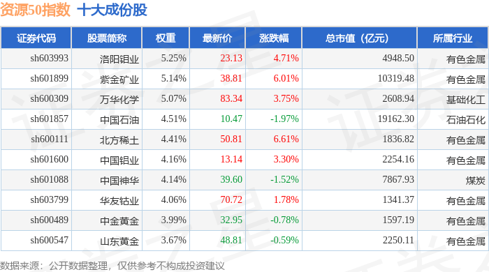 证券之星消息,2月3日,资源50(000092)指数报收于5475.94点,涨2.62%,成交1386.12亿元,换手率1.17%。当日该指数成份股中,上涨的有43家,东阳光以10.02%的涨幅领涨,下跌的有7家,中国石油以1.97%的跌幅领跌。