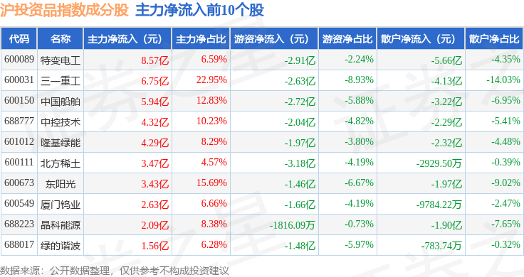 资金流向方面,沪投资品(000102)指数成份股当日主力资金净流入合计28.66亿元,游资资金净流出合计28.64亿元,散户资金净流出合计119.36万元。成份股资金流向详情见下表: