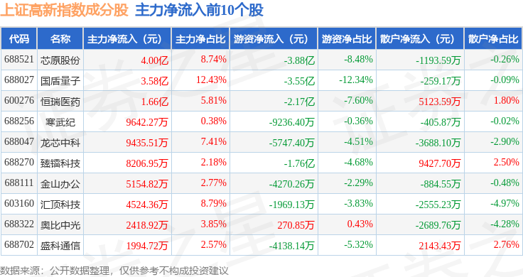 资金流向方面,上证高新(000131)指数成份股当日主力资金净流入合计2.02亿元,游资资金净流出合计8.97亿元,散户资金净流入合计6.95亿元。成份股资金流向详情见下表: