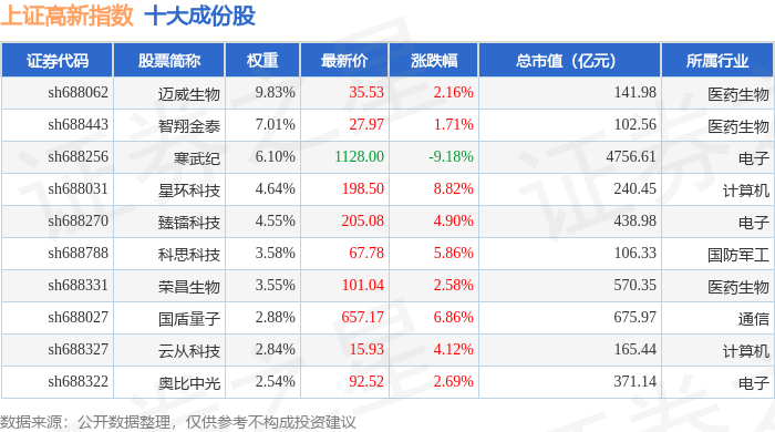 上证高新(000131)指数十大成份股详情如下: