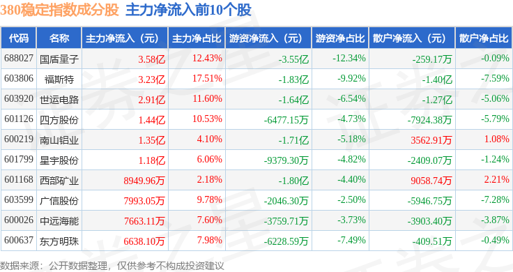 资金流向方面,380稳定(000142)指数成份股当日主力资金净流入合计5.27亿元,游资资金净流出合计18.55亿元,散户资金净流入合计13.27亿元。成份股资金流向详情见下表: