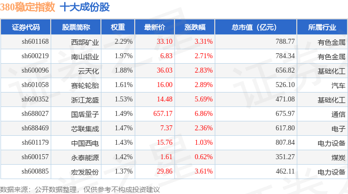380稳定(000142)指数十大成份股详情如下: